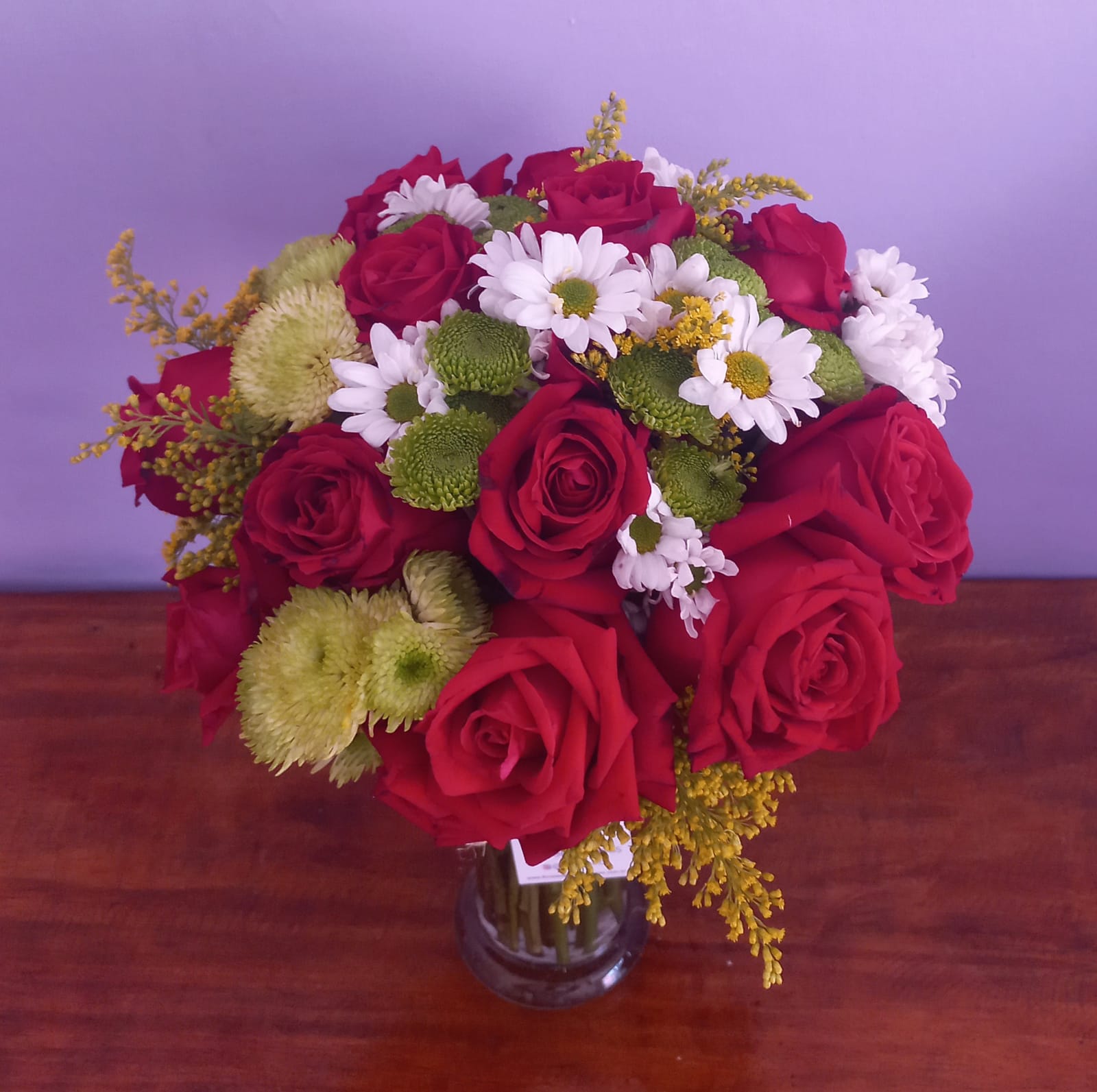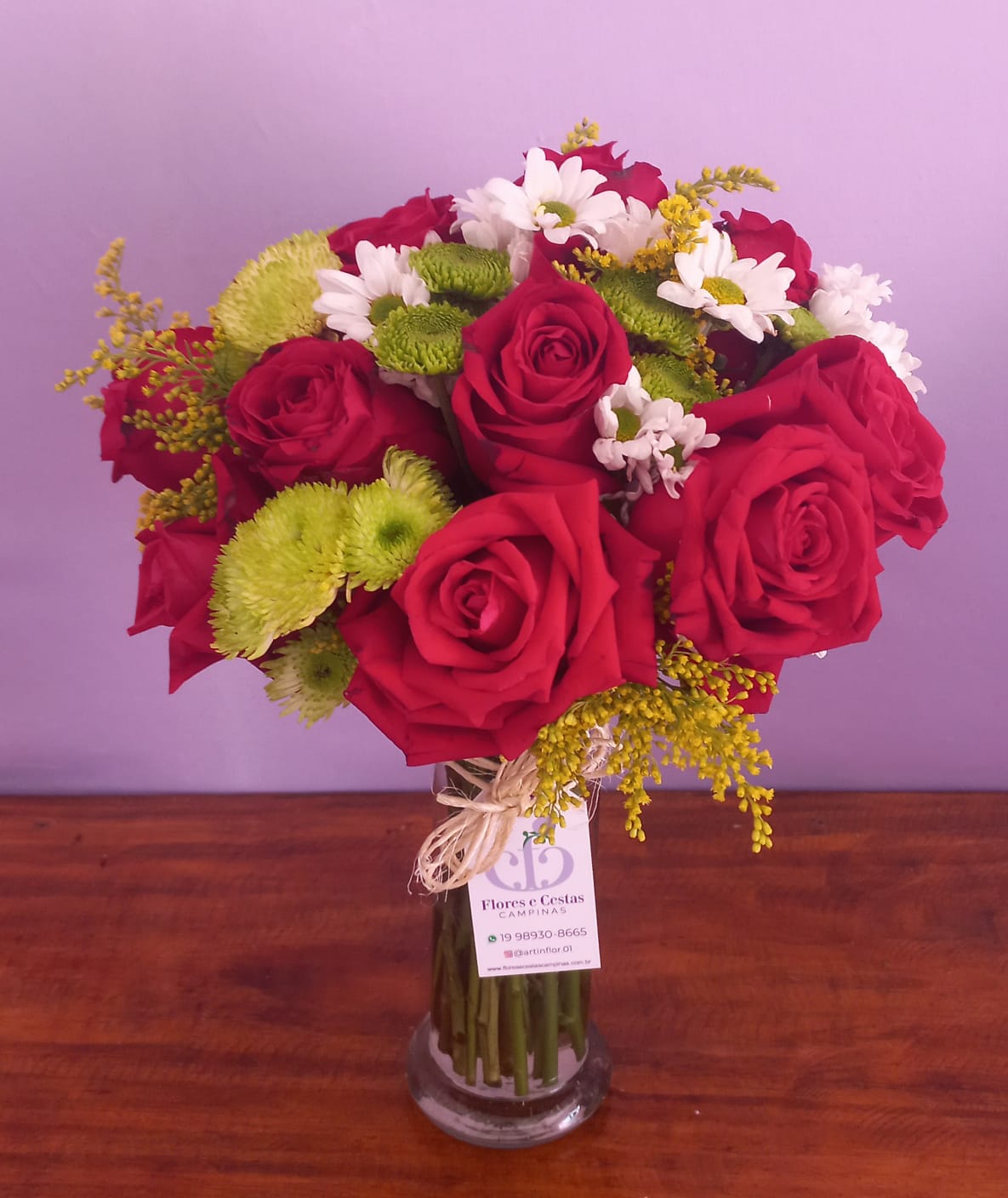 Arranjo harmonioso, mix de flores do campo e rosas vermelhas.