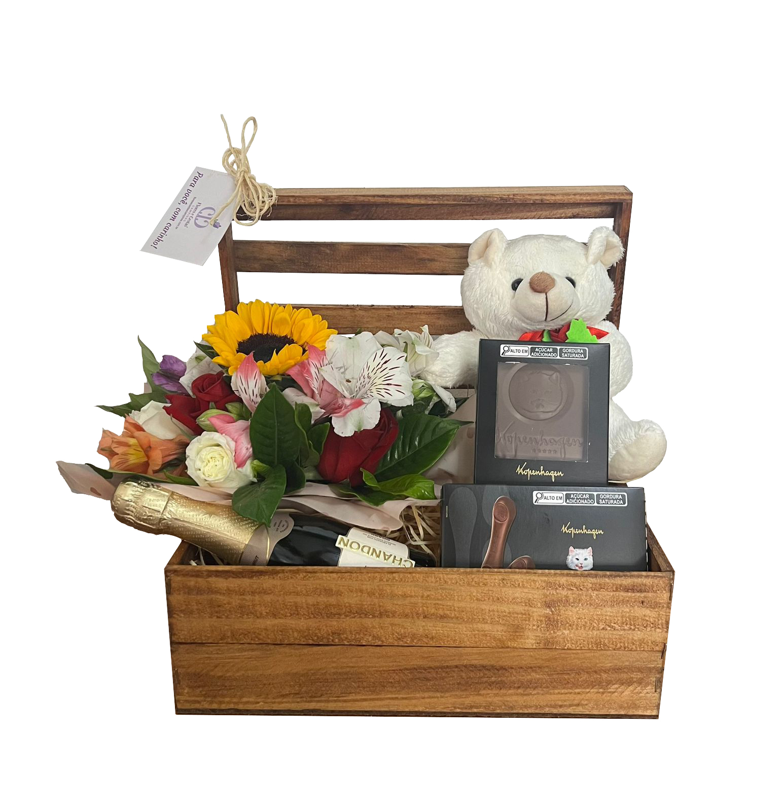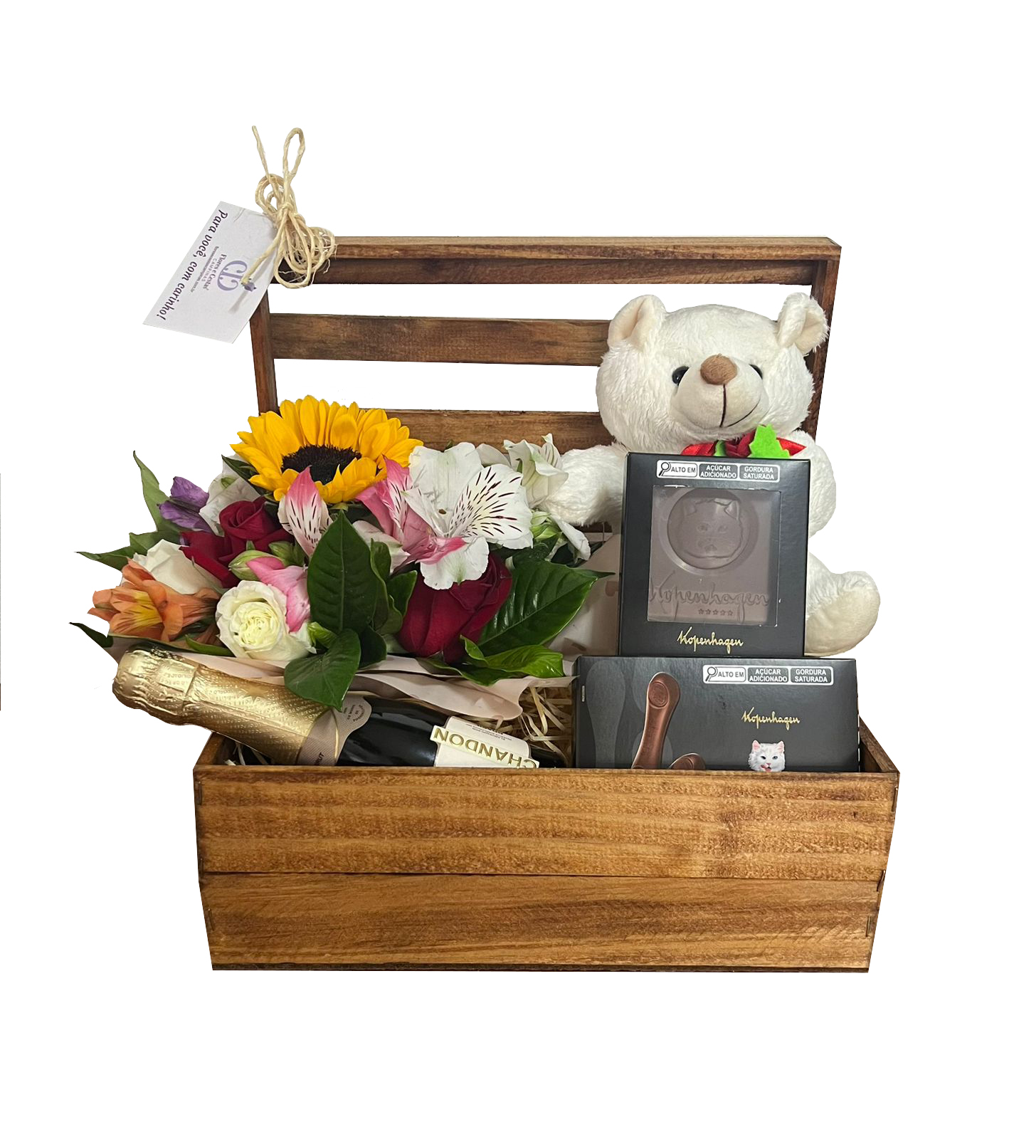 Baú de madeira elaborado com chocolates Kopenhagen, baby Chandon, pelúcia e um lindo arranjo colorido.