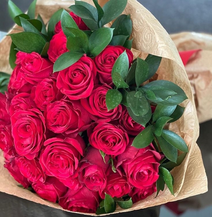 Belíssimo buquê com folhagens de ruscus, acabamento com papel Kraft e laço de ráfia