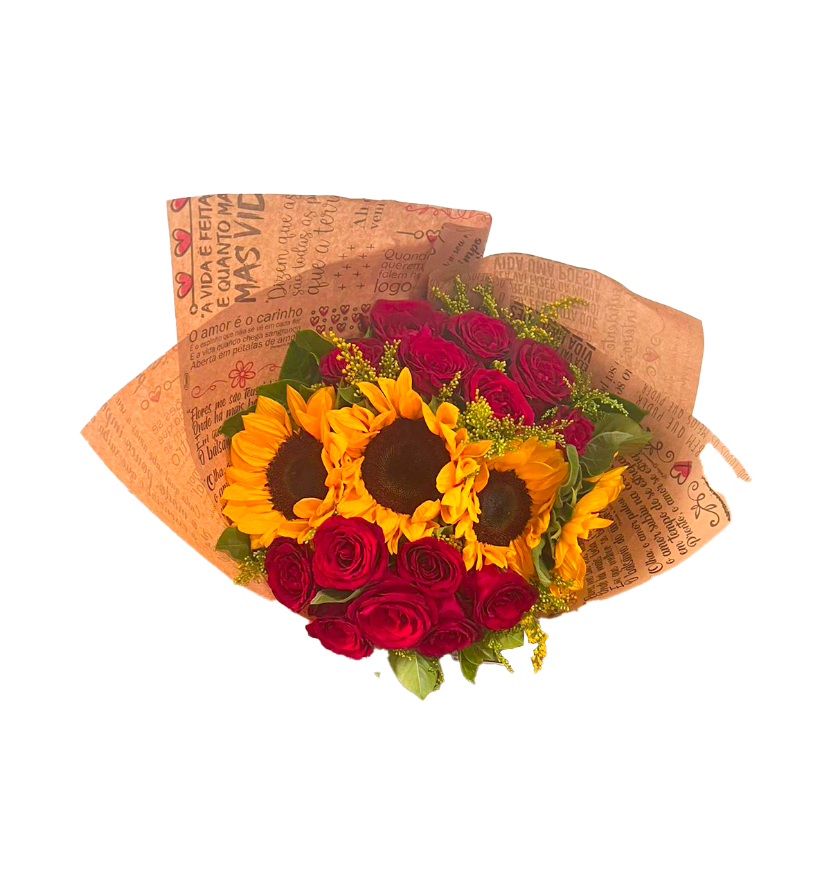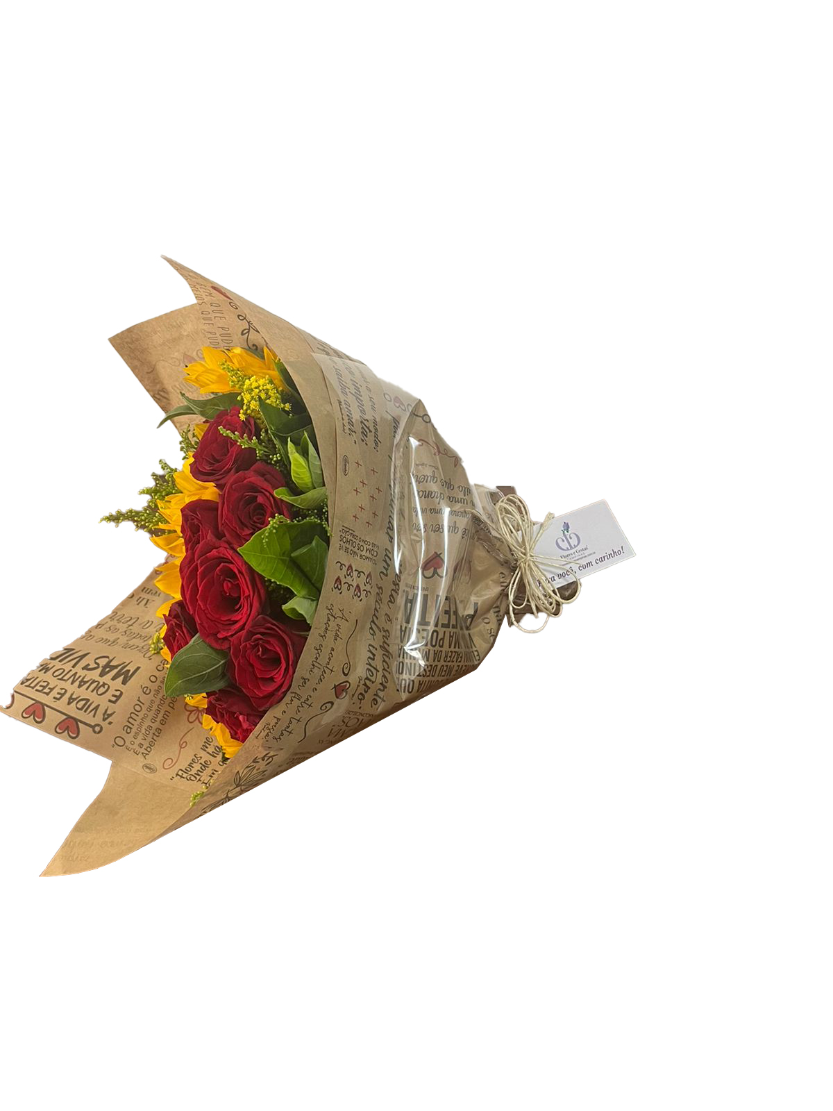 Famosa composição de rosas vermelhas com Girassóis, torna-se este lindo buquê, vistoso e supreendente.