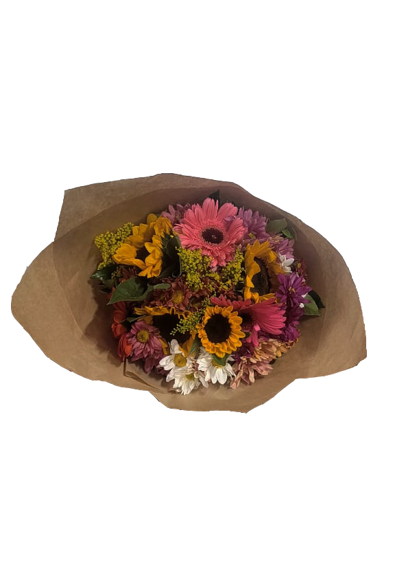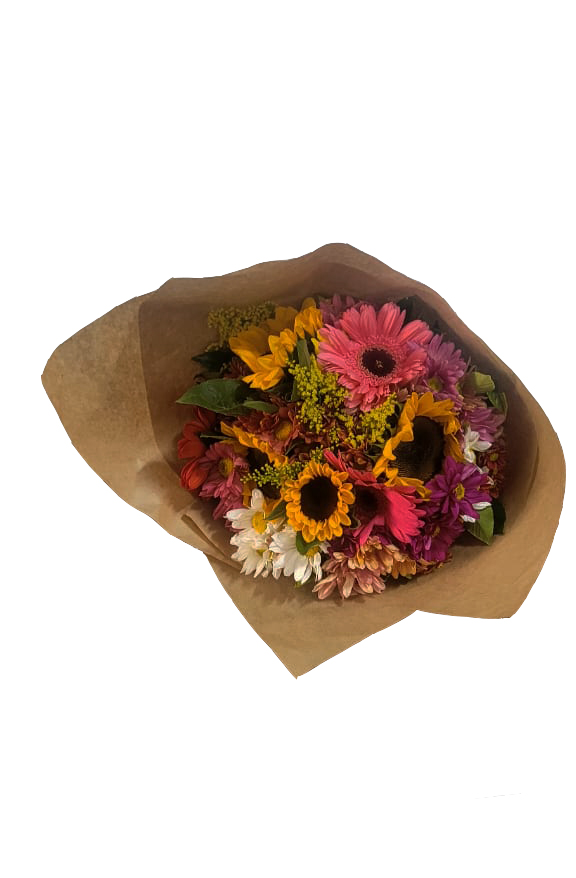 Buquê pensado em alegrar, elaborado com Flores do Campo, Girassóis e Gérrberas especialmente selecionadas.