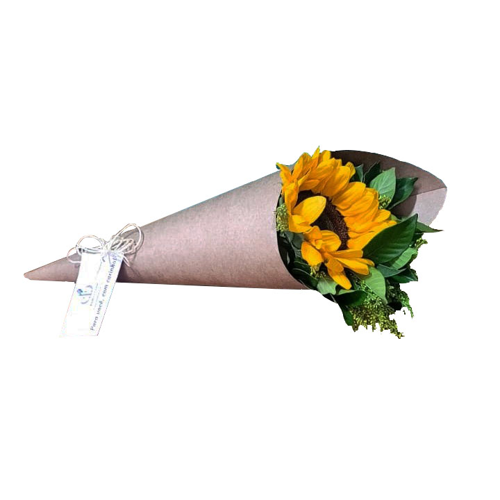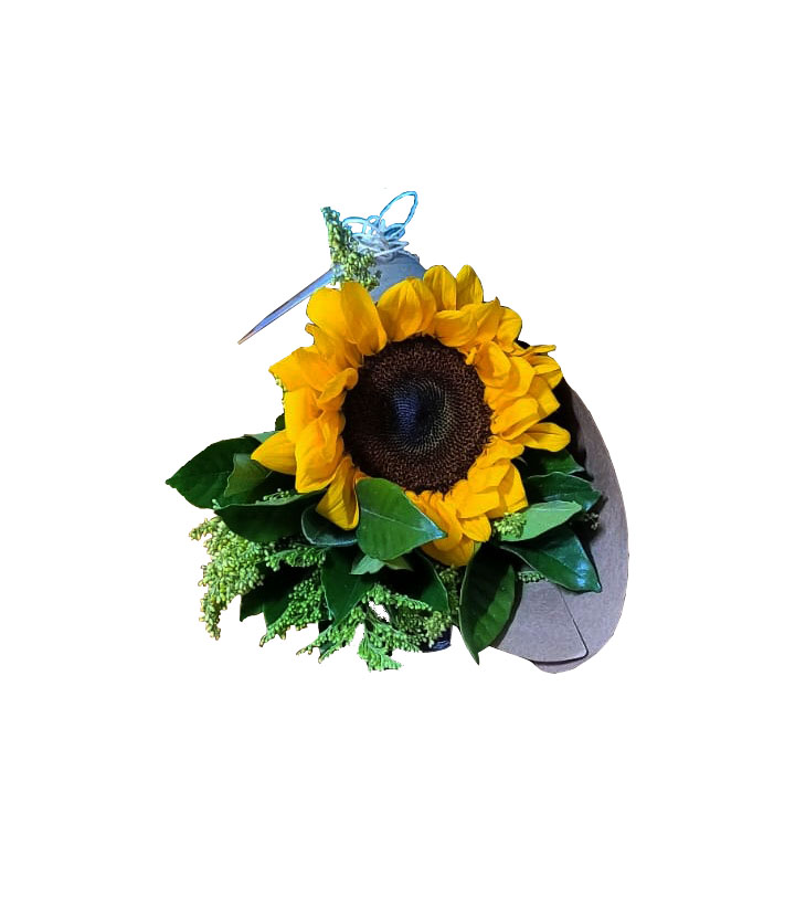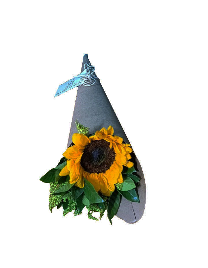 Lindo arranjo no estilo Buquê, elaborado com Folhagens, Girassol e delicado Cone de papel Kraft.