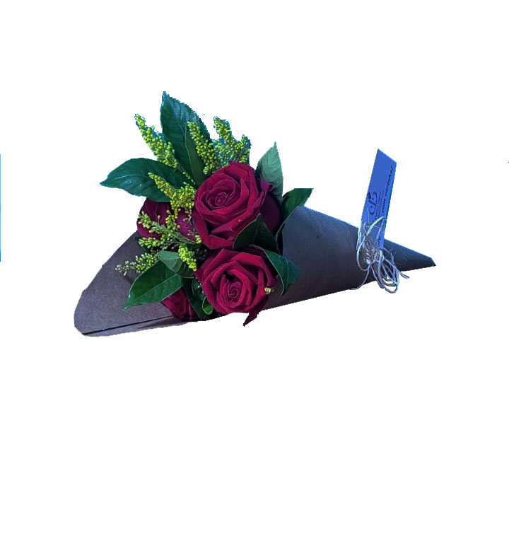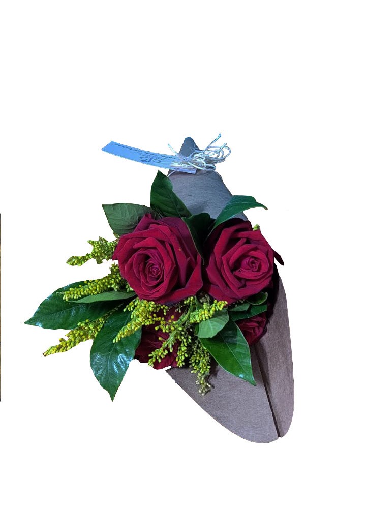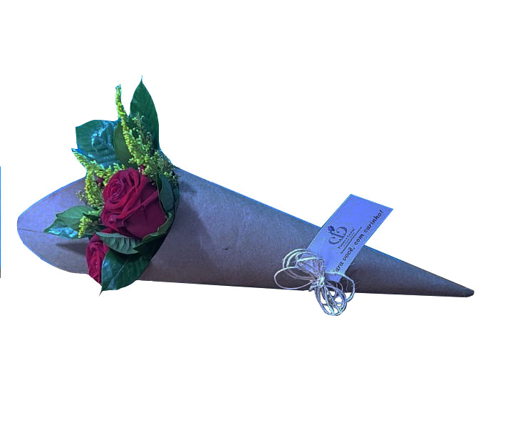 Lindo arranjo no estilo Buquê, elaborado com Folhagens, Rosas vermelhas, flores de tango e um delicado Cone de papel Kraft.