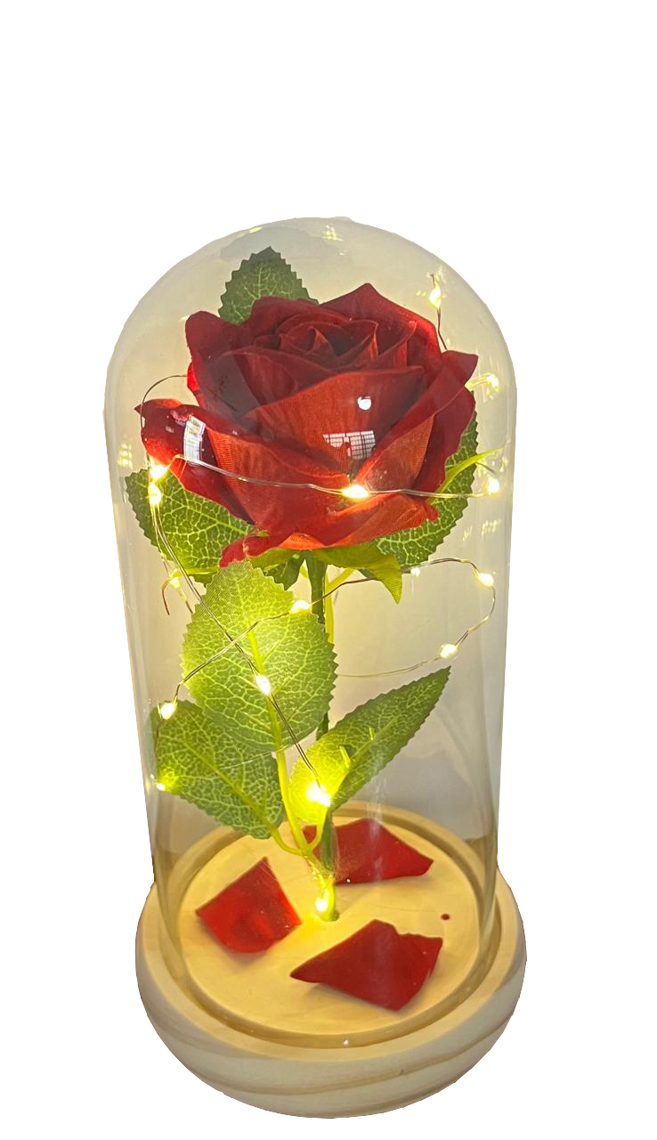 01 Rosa Permanente na cúpula de acrílico com base de Madeira e LED.